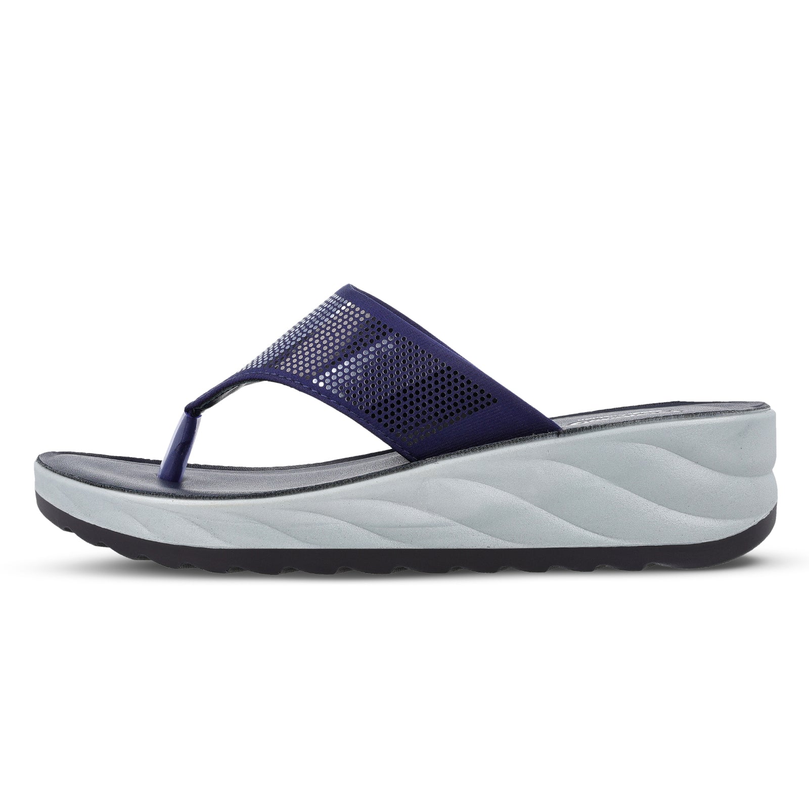 This slipper features a chic all-Navy Blue design. The thong-style strap is made from a durable synthetic material with a subtle floral pattern and a slight sheen, adding a sophisticated touch to its look. A small metallic accent on the strap serves as a stylish, non-functional embellishment. The simple slip-on design ensures easy wear, making it perfect for both quick errands and unwinding at home.
